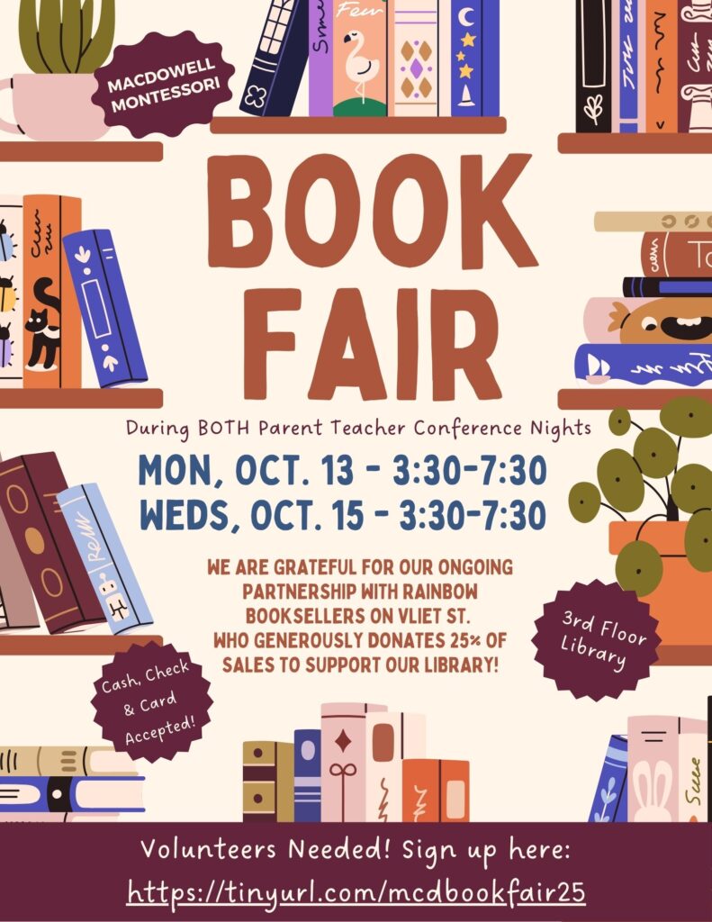 BOOK FAIR HELP: We need help setting up our book fair the morning of October 13th, browsing hours during the afternoon, as well as working the book fair during both sessions, 10/13 and 10/15. Sign up HERE : https://tinyurl.com/macdbookfair25