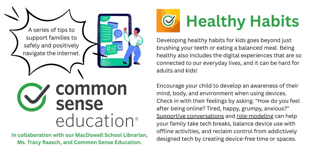 This week and in future newsletters, watch for this series of tips and strategies from our school librarian, Ms. Raasch, to help our families thrive in the digital world. We’ll focus on tips and advice to help families manage screen time, streaming, social media, YouTube, online interactions, identity protection, online gaming safety, and much more! Links: Supportive Conversations , Role-Modeling