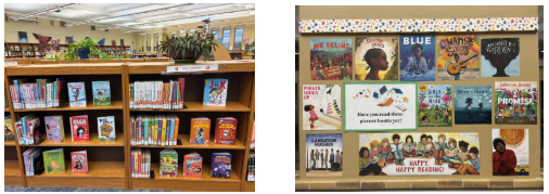 The new Everyone Fiction Section is looking great! New wall display with unused picture book covers!