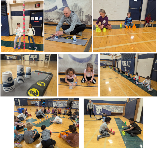 Some of the lower elementary students were introduced to speed stacking during extra PE class. Students learned some basic terms, had practice stacking and working on hand eye coordination, and even had some friendly competitions. Students learned how to stack pyramids of 3, 6, and 10 cups and learned some of the terminology and strategy that go into speed stacking. The 35 students that participated contributed to a world record attempt for “The Most People Sport Stacking at Multiple Locations”.